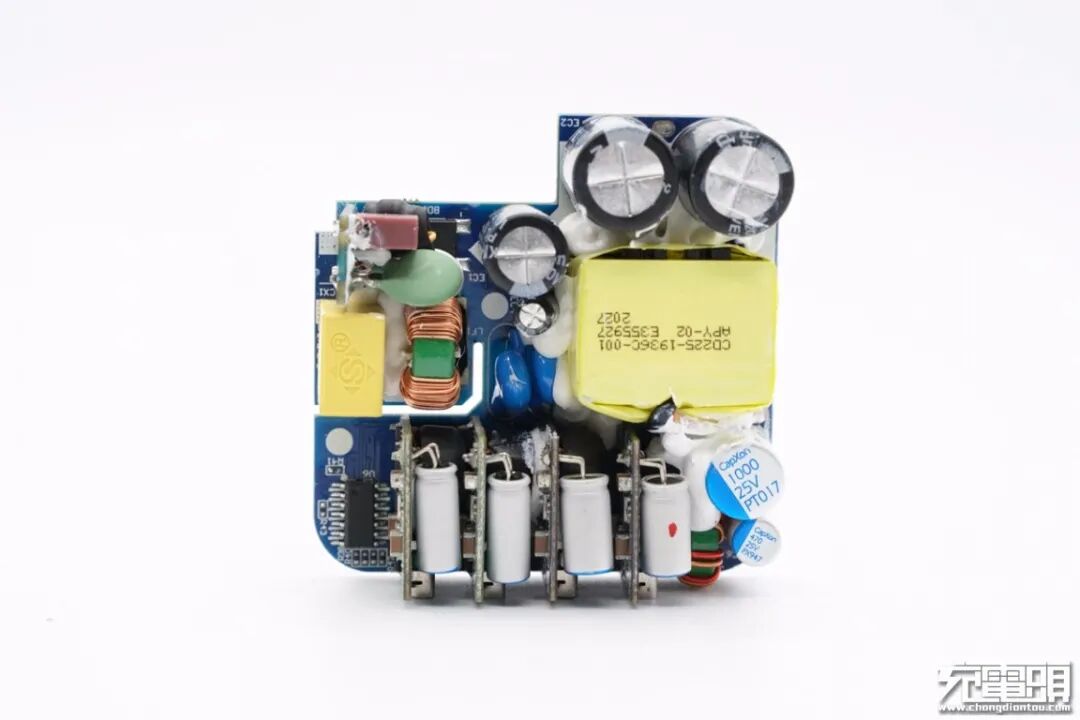 通过对电路板正背面电路分析发现,绿联65W 4C口氮化镓快充充电器采用了时下热门的开关电源定压输出,四路独立降压四口输出的设计架构。并且四个接口都采用相同的二次降压方案,由一颗MCU进行功率智能分配。下面我们从输入端开始了解各元器件的信息。