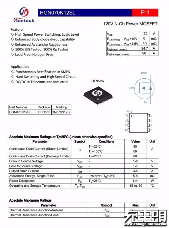 次级同步整流MOS采用恒泰柯HGN070N12SL,NMOS,耐压120V,DFN5X6封装。