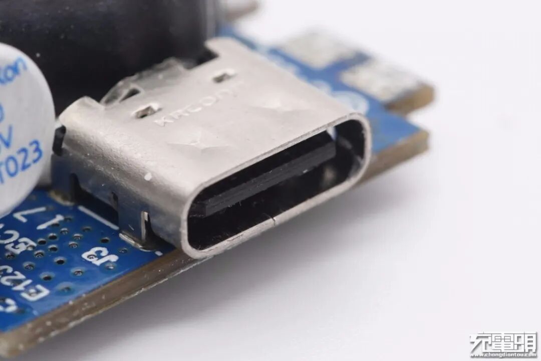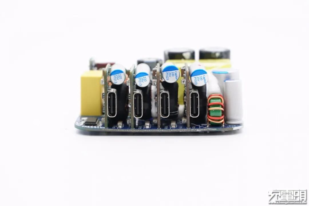 输出端一览,主板左侧设有一颗芯片,四个USB-C母座均使用小板垂直焊接。