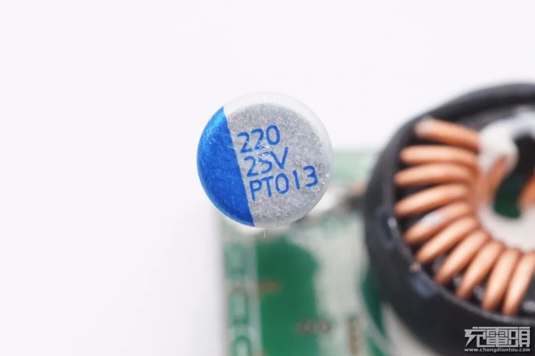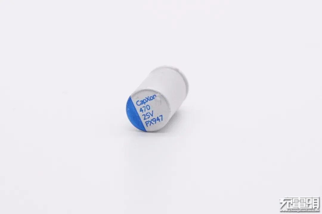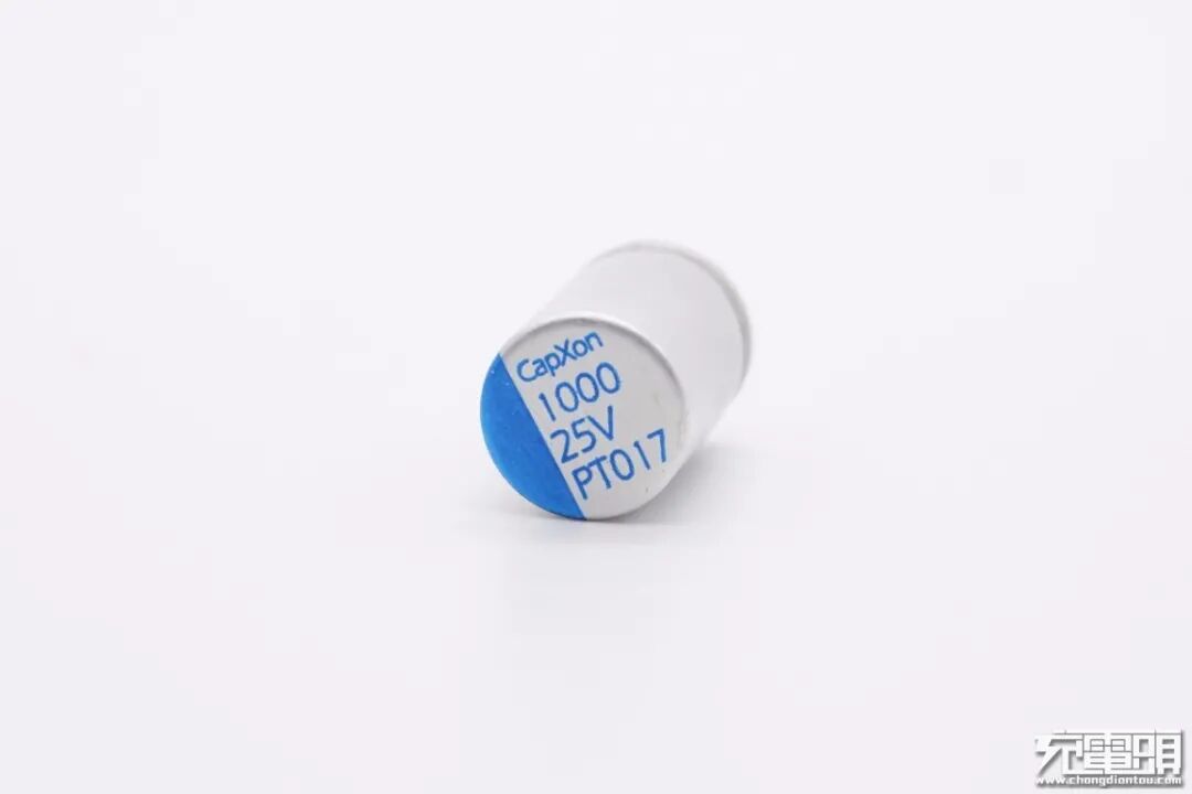 同步整流输出滤波固态电容特写,也是由丰宾提供,规格为25V 1000μF。