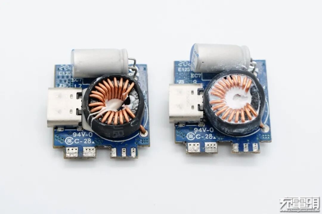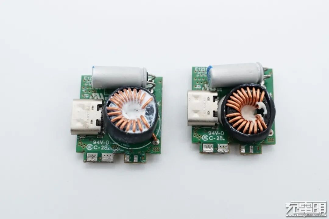 USB-C1和C2母座分别焊接在两块绿色PCB小板上,板子正面均设有降压电感和滤波固态电容。