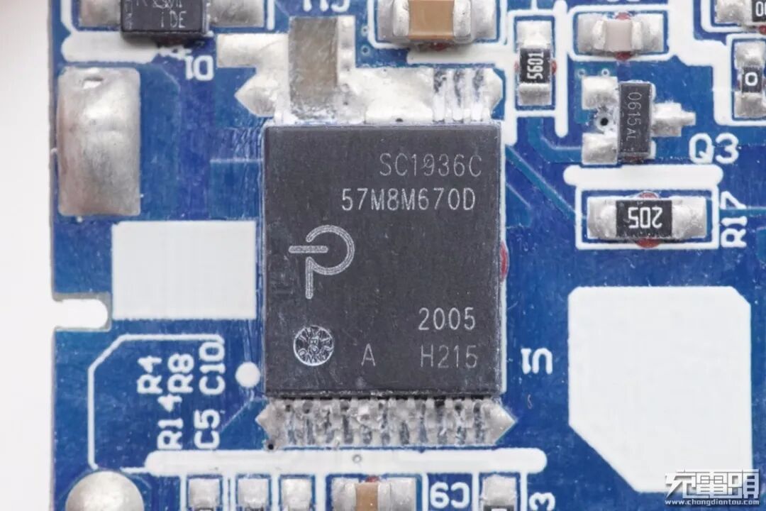 充电器主控芯片采用PI SC1936C,该芯片是PI最新发布的内置氮化镓功率器件的PowiGaN主控芯片,宽电压范围下,适配器壳体中最大75W连续功率。