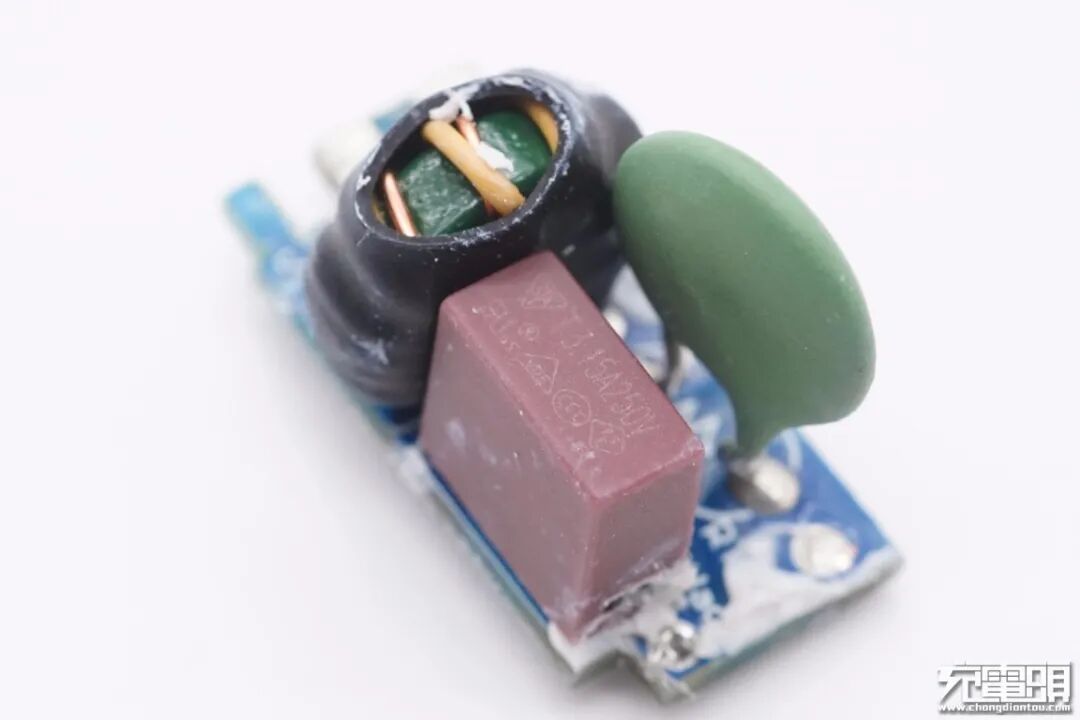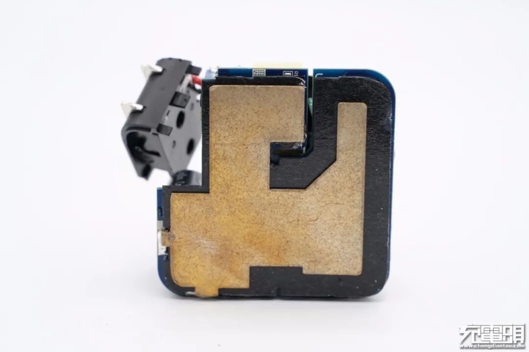 将充电器取出,输入端设有一块小板,插脚通过AC导线和小板连接,输出端焊接四块小板,后面有黑色绝缘板进行初次级隔离。