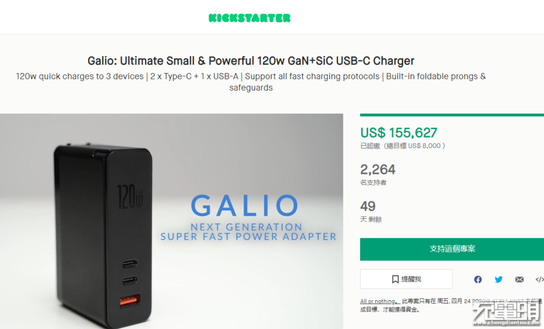 2020年2月25日倍思乘胜追击,在kickstarter众筹推出全球首款氮化镓+碳化硅 (GaN+SiC) 充电器,十天时间众筹金额就已破百万人民币(155627美元),大获成功。