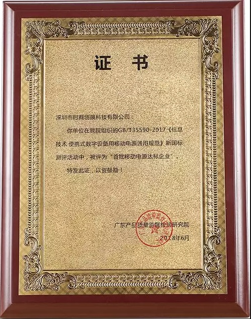 2018年,Baseus倍思获得了由广东产品质量监督检验研究院颁发的“移动电源新国标GB/T35590-2017评测《首批移动电源达标企业》”证书,成为了广东质检研究院首批“移动电源新国标”达标企业前十家合格企业之一。