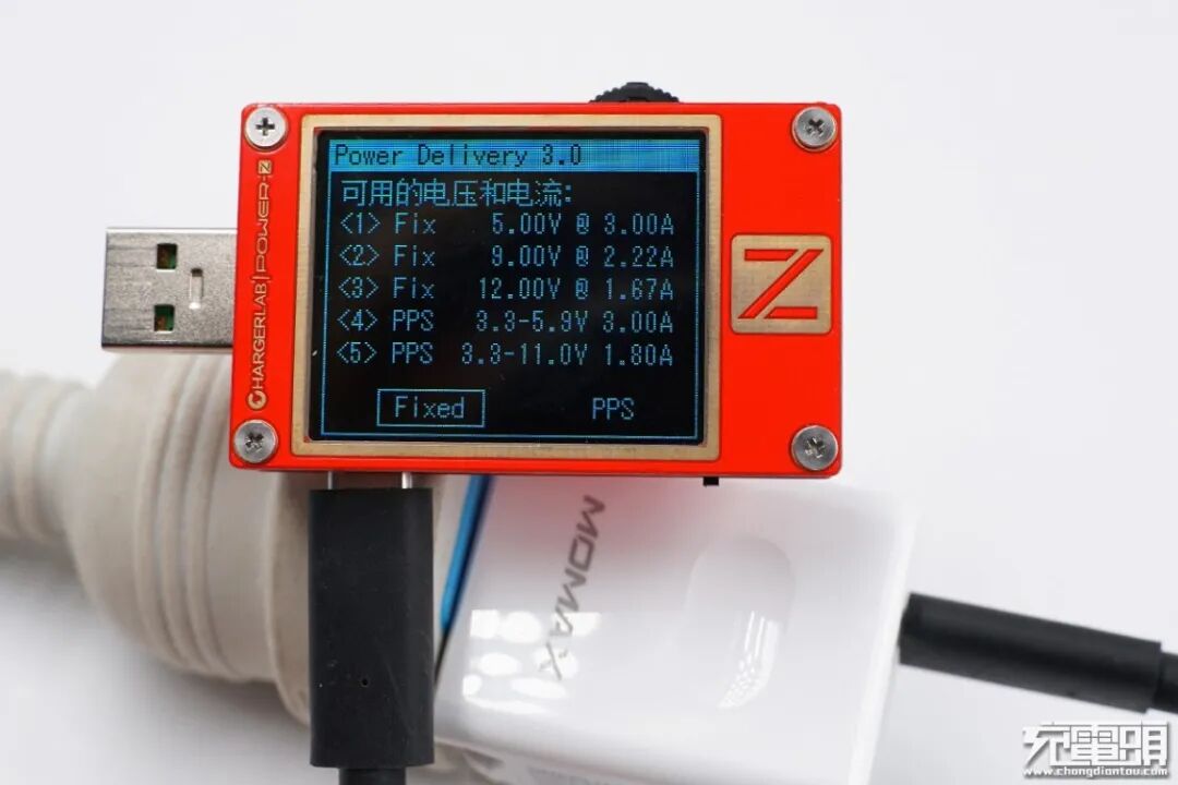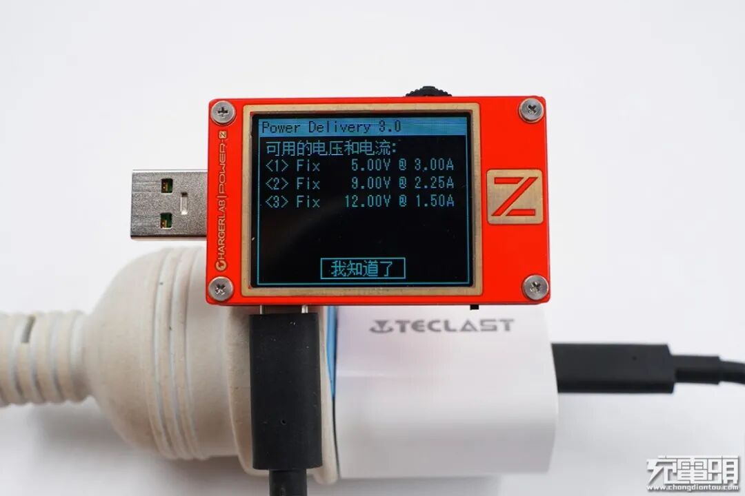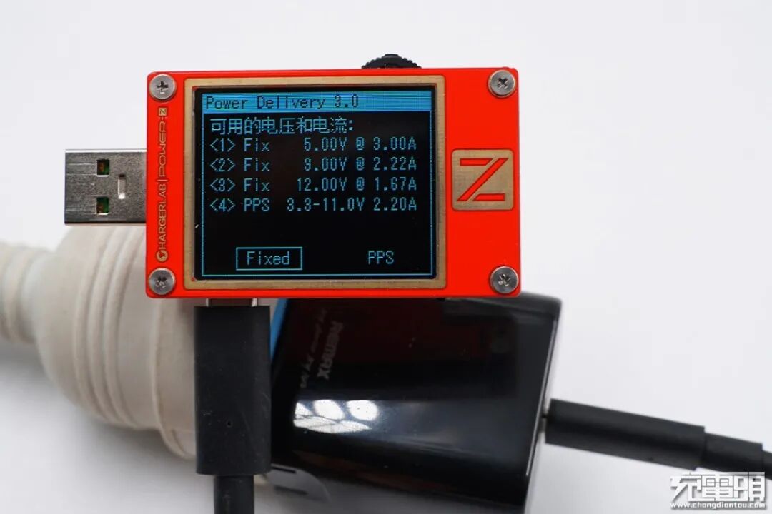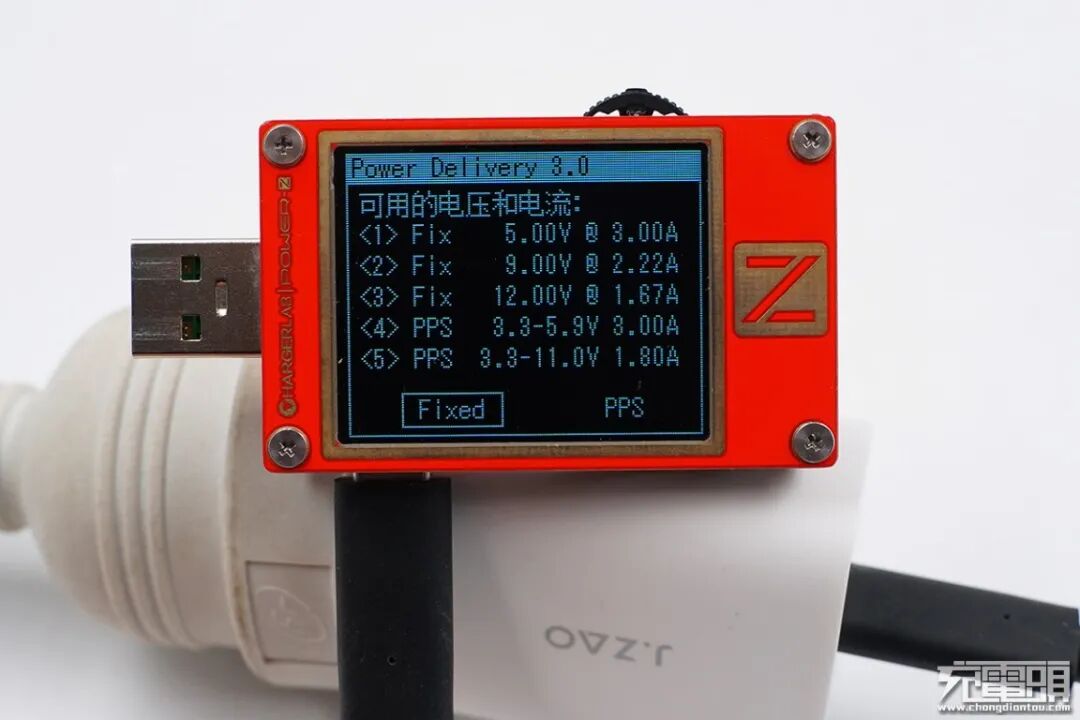 使用ChargerLAB POWER-Z KT002检测充电器PDO,支持5V3A、9V2.22A、12V1.67A、3.3-11V 2A四个电压档位。