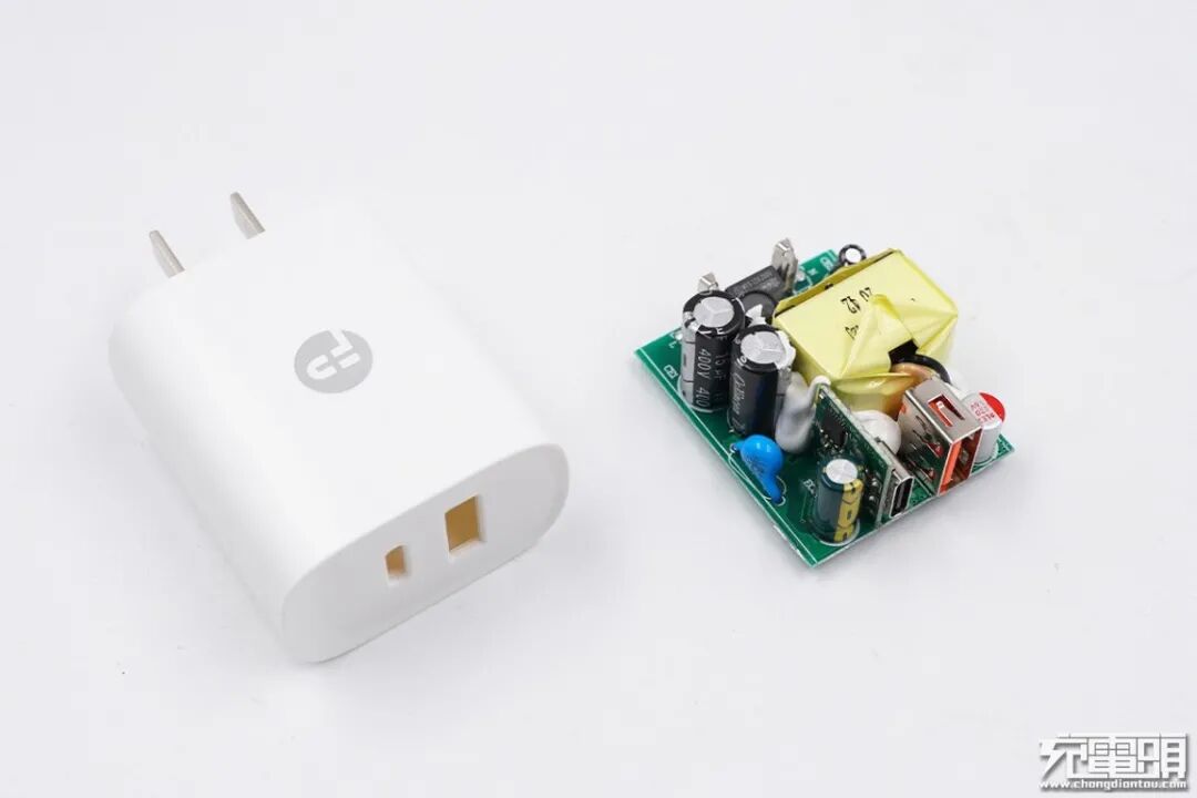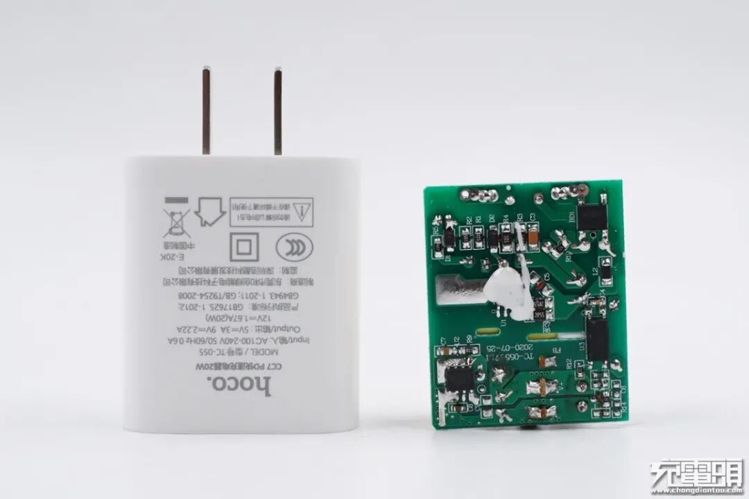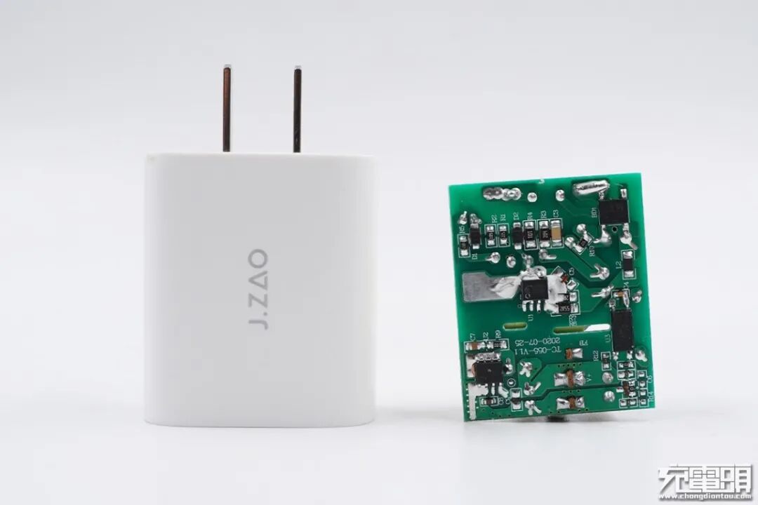 京东京造20W PD快充充电器在协议兼容性方面延续了上一代的18W PD快充产品,虽然充电器的功率仅提升2W,但是内部却采用了全新升级元器件的用料,两颗诚芯微快充电源芯片就实现了AC-DC开关电源变换,性能提升的同时,电路更加精简。