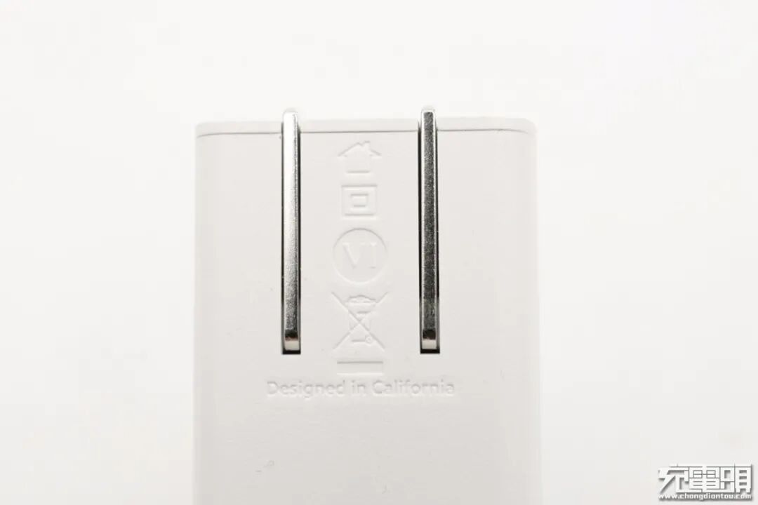 另一端配备可折叠插脚,从机身壳上可以了解到充电器还通过了美国DoE VI级能效认证。