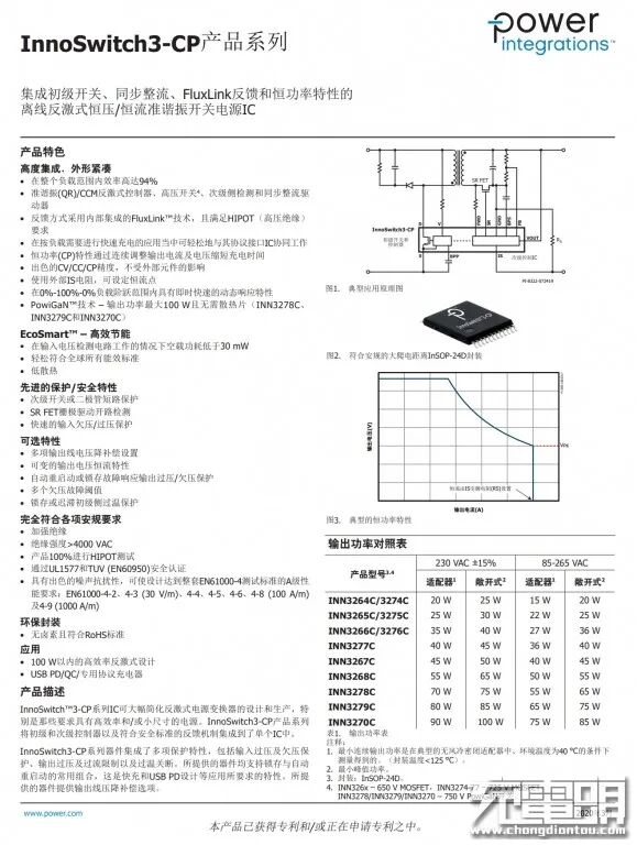 充电器主控芯片采用PI INN3279C,INN3279C内置750V PowiGaN™技术,适配器密闭环境中宽电压输入可输出65W,这里降额使用是为了降低发热。PI全集成IC内部集成准谐振反激控制器和集成的主开关管,同步整流控制器和内置反馈,以及恒功率输出。