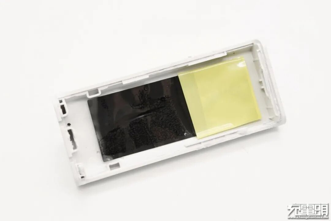 除氮化镓技术因素外,采用贴片保险丝、Y电容等小器件,电容、工字电感等柱状器件横置,使用绝缘胶带缠绕确保安全,变压器沉板处理等设计也很大程度上帮助缩小充电器体积。此外还贴有石墨导热贴纸避免局部热点,产品细节讲究。
