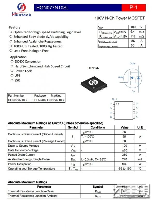 次级同步整流MOS管采用恒泰柯HGN077N10SL,NMOS,耐压100V,逻辑电压驱动,为同步整流而优化。