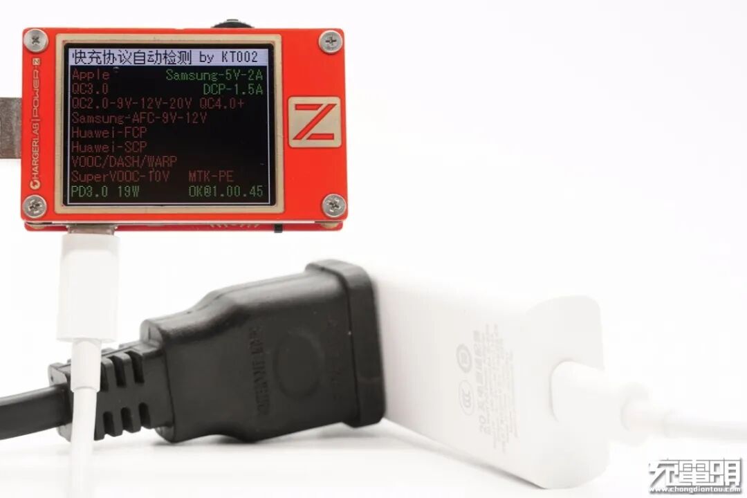 使用ChargerLAB POWER-Z KT002检测USB-C口输出协议,显示支持Samsung 5V2A、DCP和PD3.0协议。