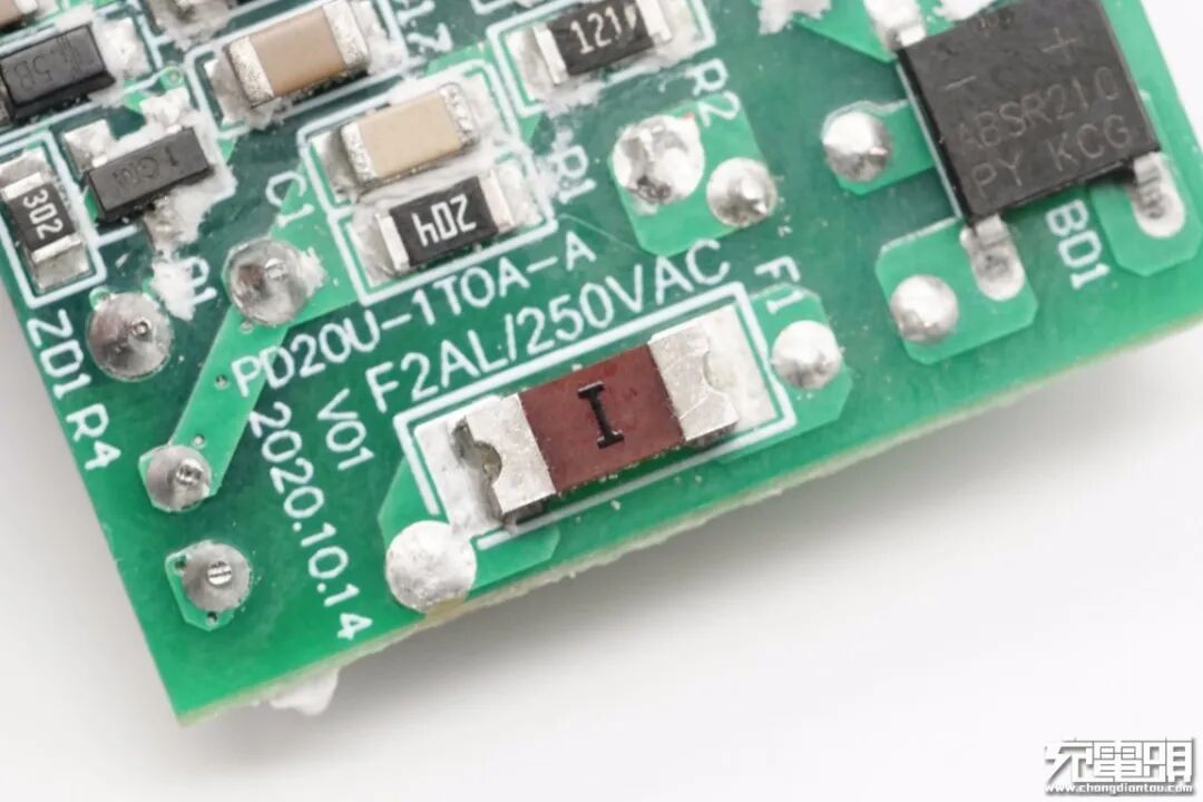 经过对充电器电路观察分析发现,贝尔金这款20W PD快充充电器采用开关电源宽范围输出,协议芯片控制输出电压的典型架构。下面我们就从输入端开始一一了解各元器件。