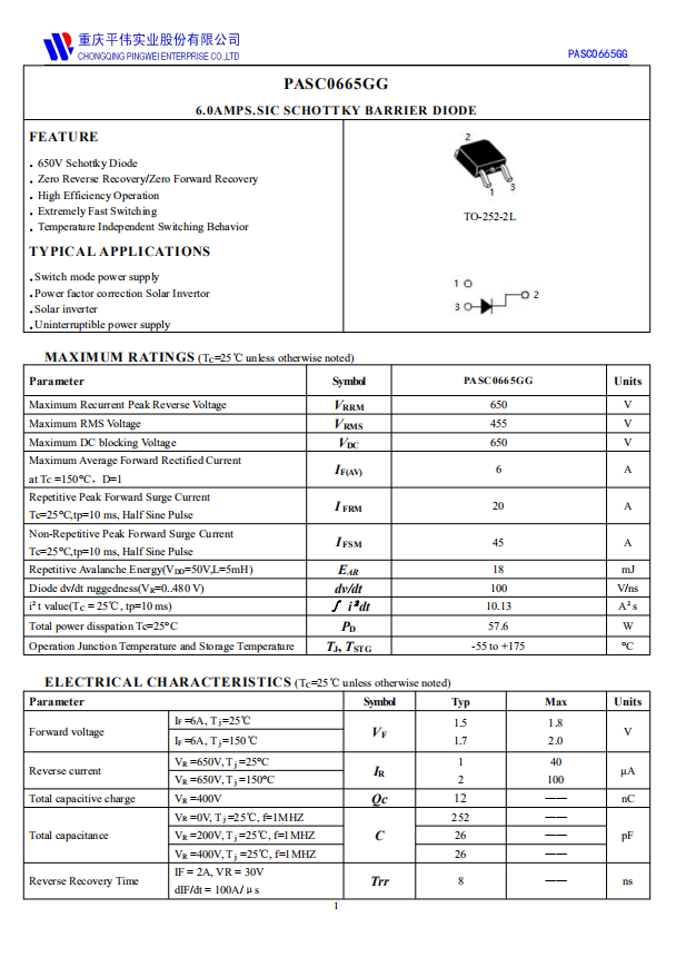 平伟PASC0665GG是一款650V肖特基二极管,具有零反向恢复/零正向恢复、高效运行、切换速度极快、不受温度影响的开关特性。适用于开关电源、功率因数校正电路、太阳能逆变器、不间断电源等领域。