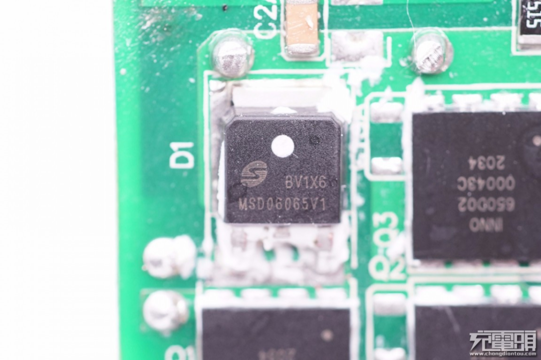 充电头网通过拆解了解到,这款充电器内置PFC升压电路,采用LLC+GaN高性能架构。PFC升压部分采用恩智浦控制器,并选择美浦森MSD04065G1碳化硅二极管以及英诺赛科INN650D2氮化镓开关管进行整流。美浦森MSD04065G1是一颗650V耐压的碳化硅肖特基二极管,TO252封装。