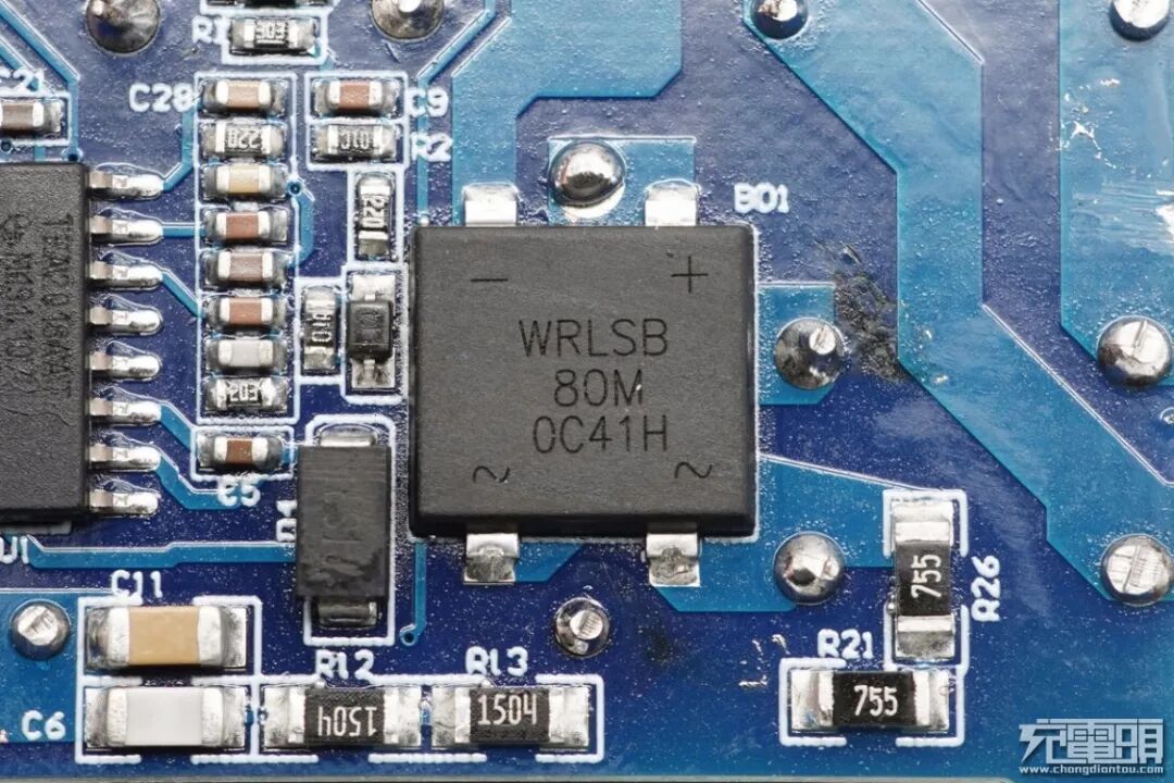 输入端整流桥WRLSB80M来自深圳市沃尔德实业有限公司,这颗软桥通过较软的恢复曲线,比较平滑的关断特性,可以降低二极管结电容达到非常少的谐波振荡产生的效果。选用的LSB封装,拥有良好的散热特性,帮助中大瓦数适配器提升可靠性,单颗可做60W+。