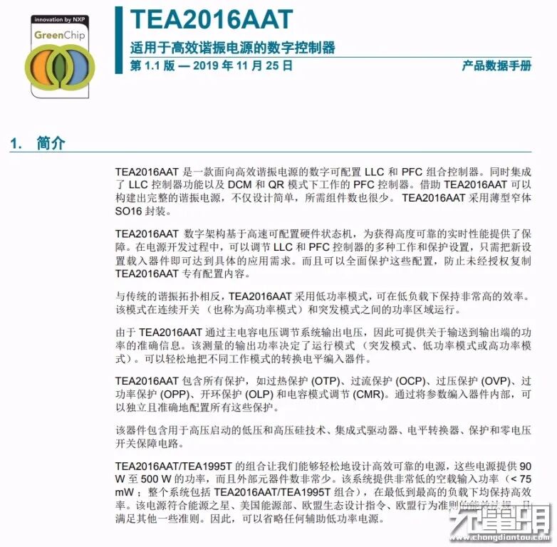 充电器初级PWM主控芯片采用NXP恩智浦TEA2016AAT,一颗芯片内置LLC控制器和PFC控制器,内置数字架构控制,简化了设计的同时减少外围元件数量,芯片内置多重完善的保护功能。