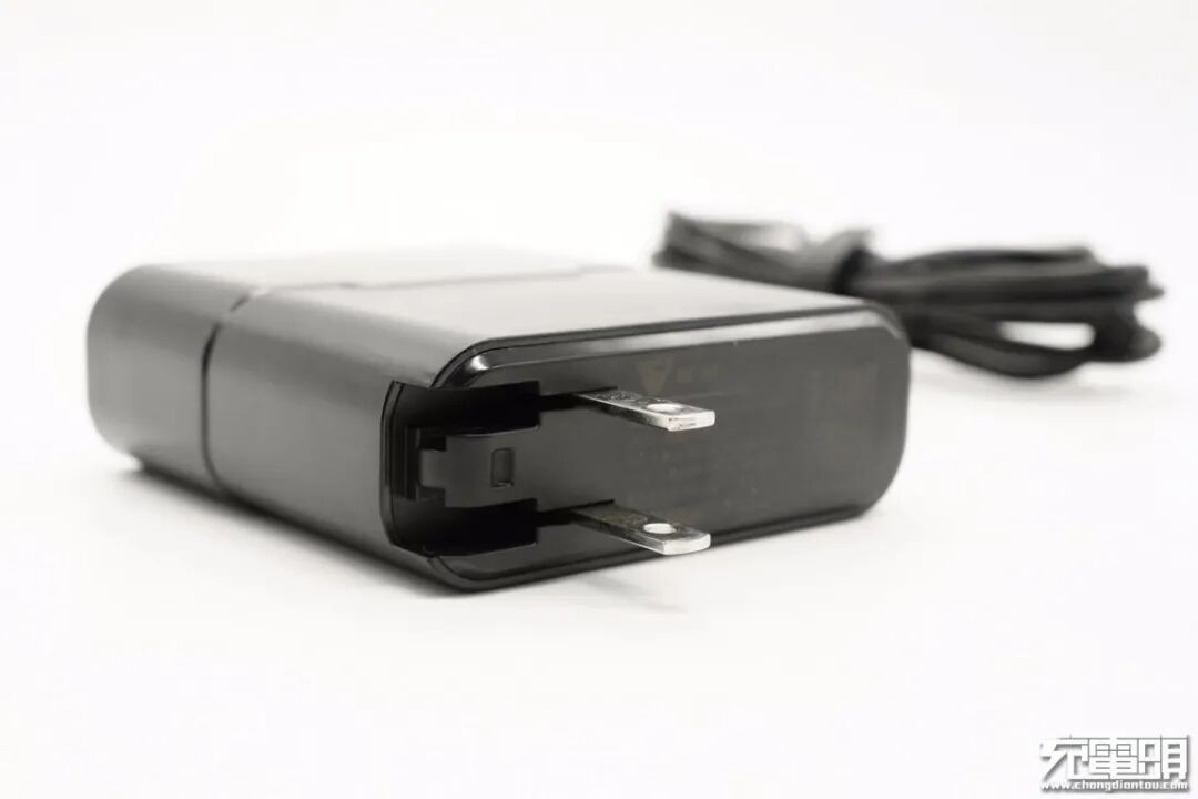 充电器采用PC阻燃材质黑色外壳,表面哑光处理,机身两侧过渡圆润。机身壳前后大小不一样,中间看上去有凸出,整个外壳像是拼装而成,设计很有特点。