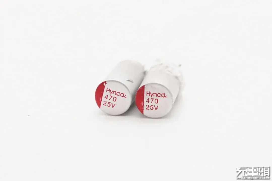 两颗输出滤波固态电容特写,规格都是25V 470μF,来自深圳市宏远纳川电子有限公司。