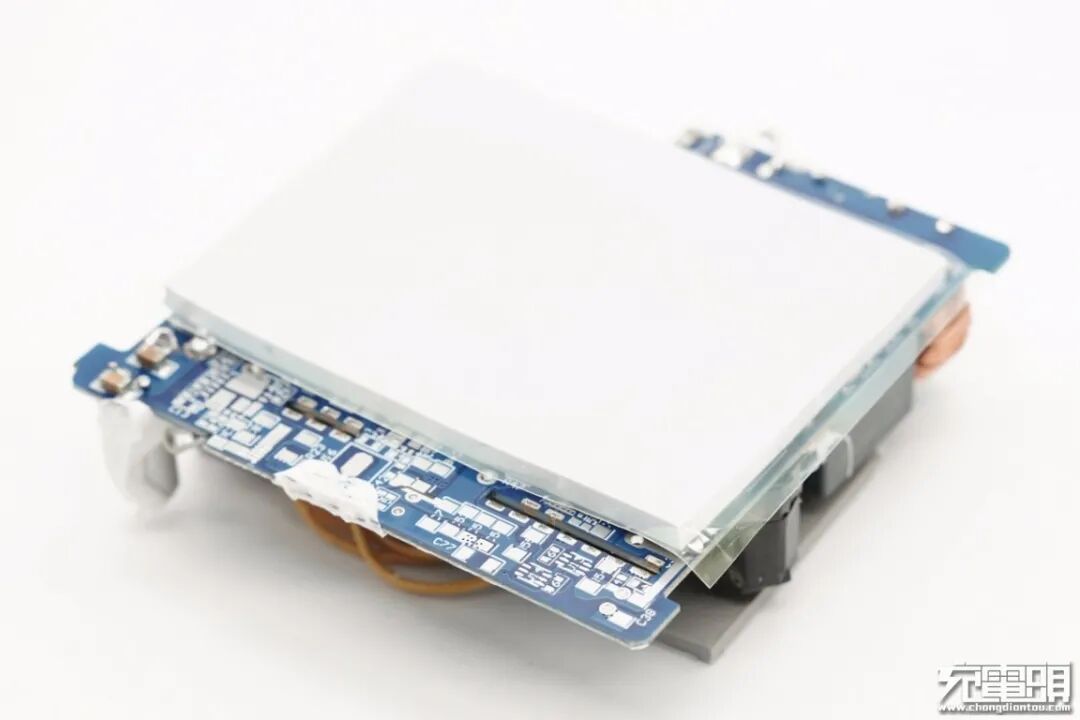 取下导热垫,正面最显眼的是PFC升压电感和变压器。输出端预留有空间和焊盘,可以基于这款设计焊接PD降压小板生产多口PD快充产品。