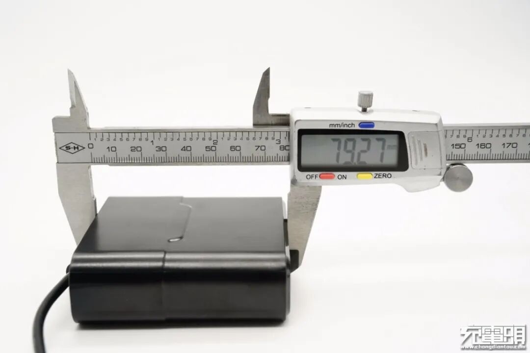 使用游标卡尺实测充电器机身长度约为79.27mm。