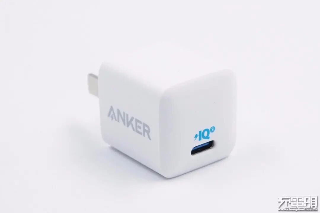 充电器外观风格与前代Anker安克 Nano 18W充电器别无二样,本体使用阻燃塑料材质,四周表面磨砂,接口面板则为亮面,侧面丝印有“ANKER”LOGO,增加了品牌辨识度。亮面的接口面板手感顺滑,与微磨砂的机身形成错落感,也能使用户迅速找到接口面板。充电器接口设置在靠下的位置,USB-C接口内使用蓝色胶舌。接口的上方丝印着IQ3字样,它是ANKER独家的“IQ 3.0” (全称PowerIQ 3.0)快充协议,兼容了PD、QC、Apple 2.4A等快充协议。