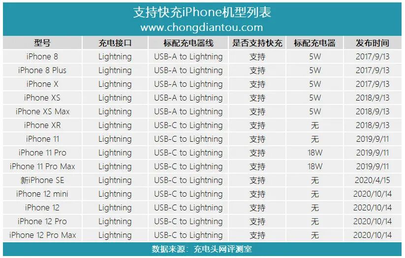 据充电头网统计,在iPhone 12系列手机发布之前,苹果旗下就已经有10款支持USB PD快充的手机,不过其中多达8款机型均标配的是5W充电器,仅两款标配了18W PD快充,原有配件市场对PD快充的需求一直比较旺盛。