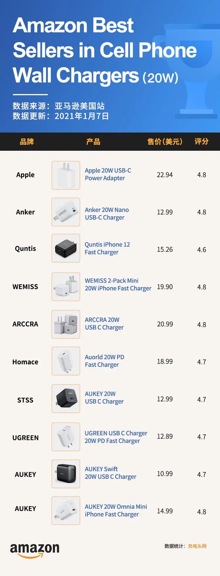二、Amazon亚马逊20W PD充电器销量排行榜