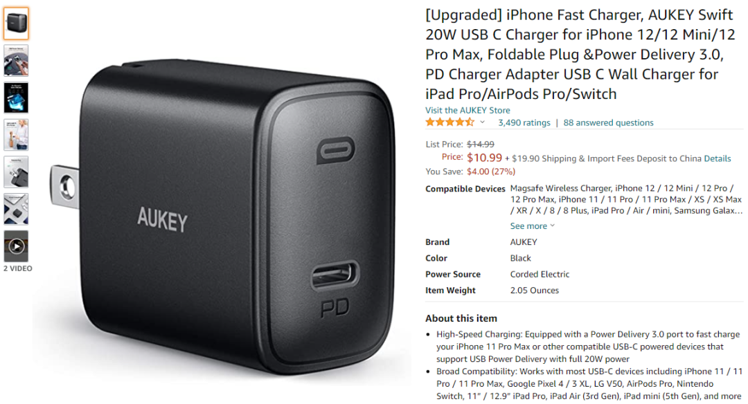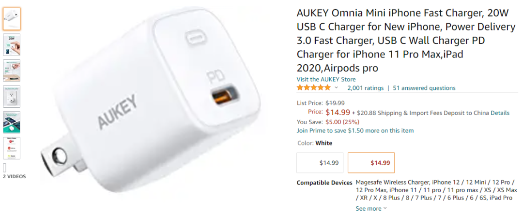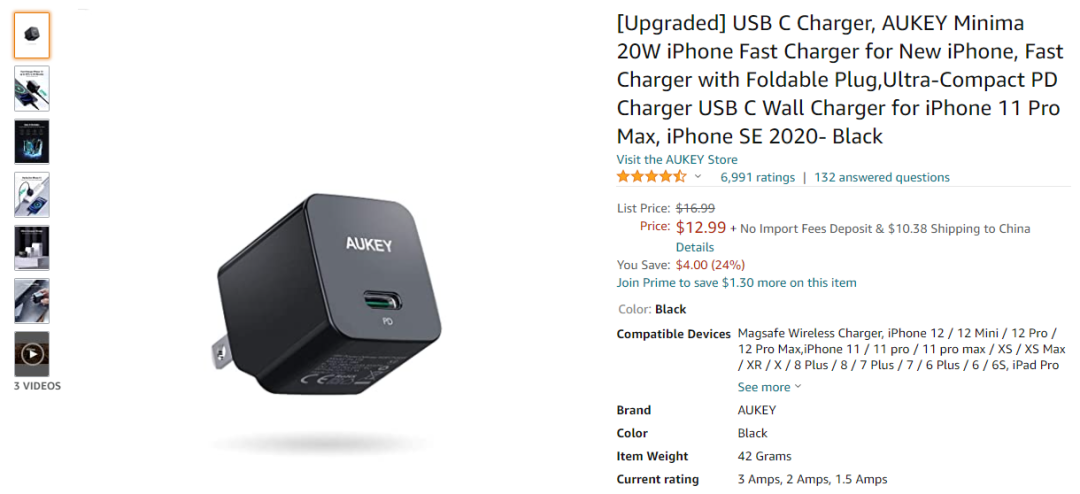 AUKEY 20W USB-C Charger(以下简称AUKEY)排名第七,他家的部分产品也在国内售卖,小伙伴应该也有印象。值得一提的是亚马逊20W PD充电器销量排行榜上有三款AUKEY的充电器,实力不容小觑!