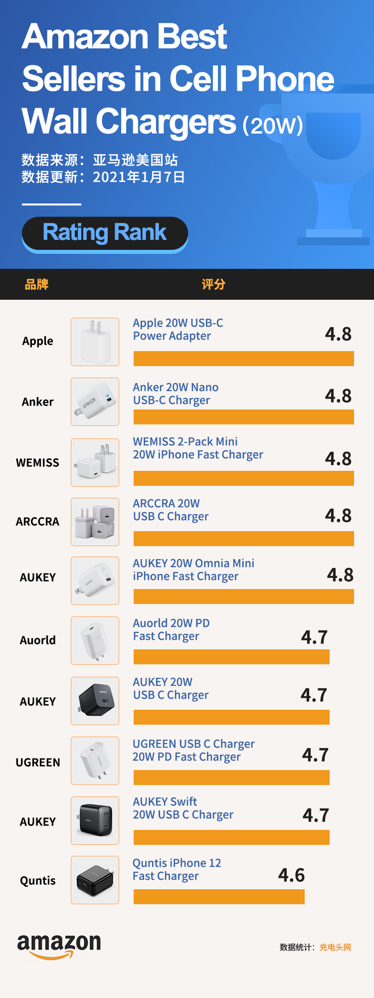 Amazon亚马逊官方有一个“Best Sellers”榜单,每小时更新。充电头网在充电器类目中按照顺序找出了20W PD充电器,统计日期为2021年1月7日,产品价格、评分、评论数均以当时的数据为准。叮咯咙咚呛,下面正式揭榜!