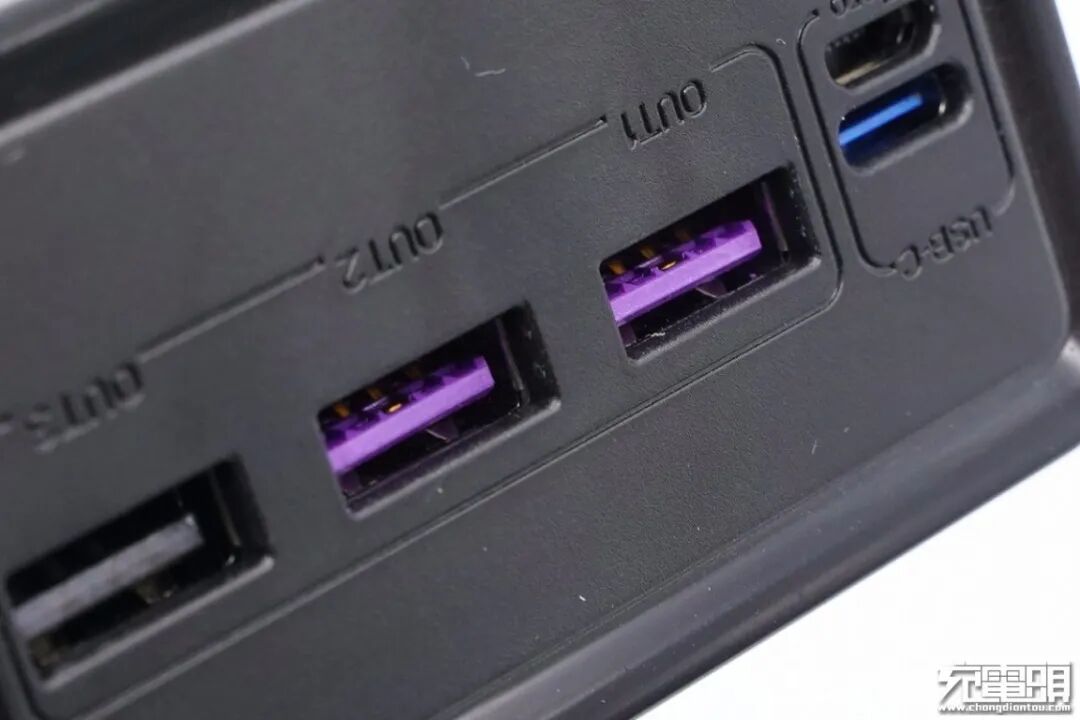 顶面配有Micro USB输入接口、USB-C双向快充口、以及3个USB-A接口。UBS-C口蓝色胶芯不露铜,USB-A口胶芯分为紫色和黑色,紫色口支持快充输出,方便用户区别。