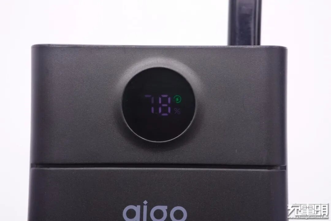 机身正面上方设有一条分界凹槽,两边分别是LED数显屏以及aigo品牌logo。