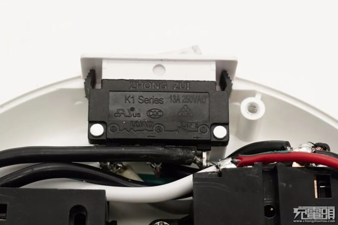 二、联想20W快充插座拆解机身塑料壳使用四颗螺丝封装,拆掉胶套取出螺丝即可打开。电源线、三个AC插孔模块、充电器PCB板都是使用螺丝固定。