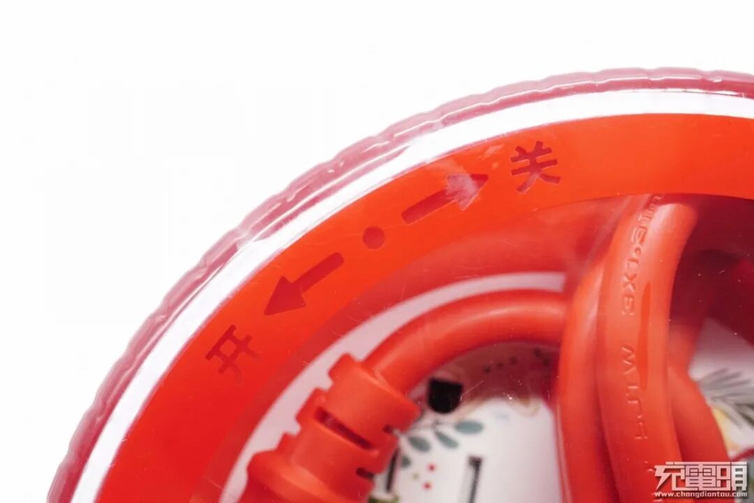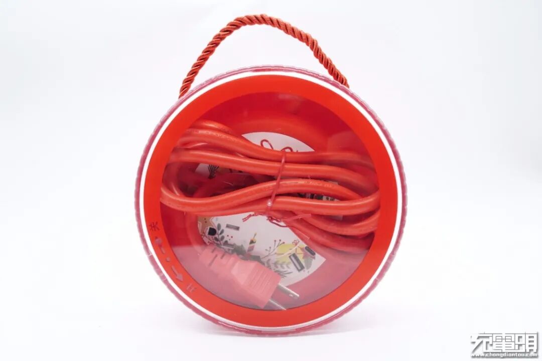 插座配备一条红色电源线,机身采用PC阻燃材质白色塑料壳,边缘套上红色胶套。