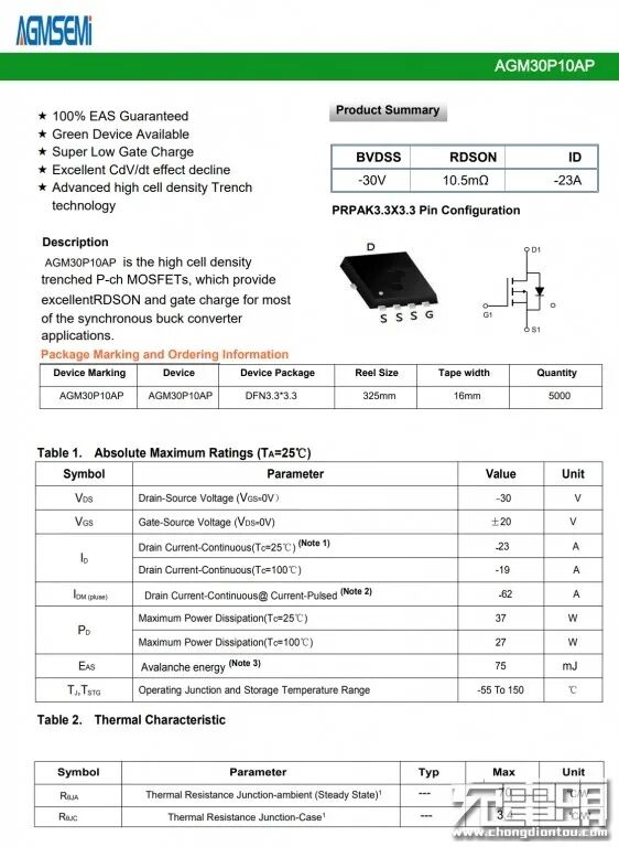 输出VBUS开关管特写,AGMSEMI AGM30P10,PMOS,耐压30V,导阻10.5mΩ。