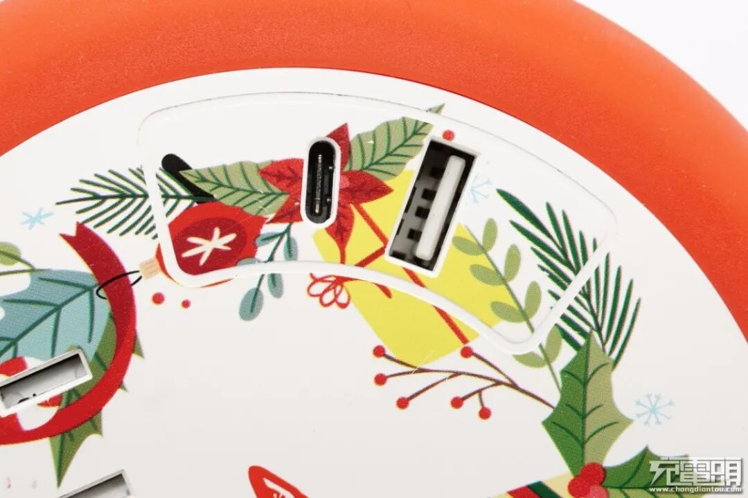 机身顶部印有花草图案,中心是一只梅花鹿,设计上很喜庆。此外顶部配有三个两脚插孔以及1A1C快充接口。机身底部设有多个散热孔,中心印有产品参数信息