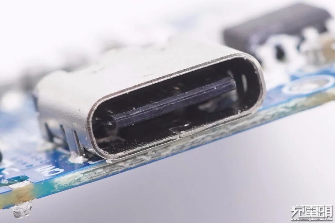 USB-C母座特写,过孔焊接,黑色胶芯不露铜。