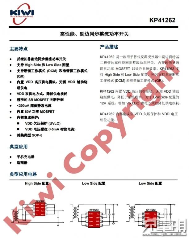 KP41262内置60V功率MOS管,采用SO8封装。内置VDD高压供电模块,无需VDD辅助绕组供电,降低了系统成本。