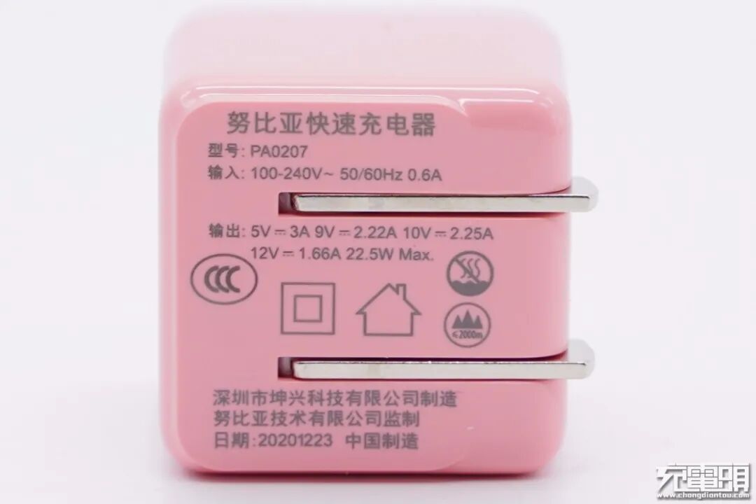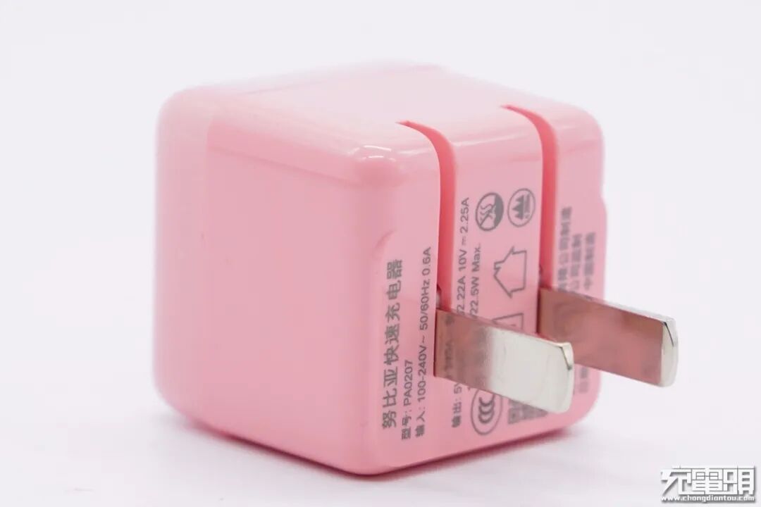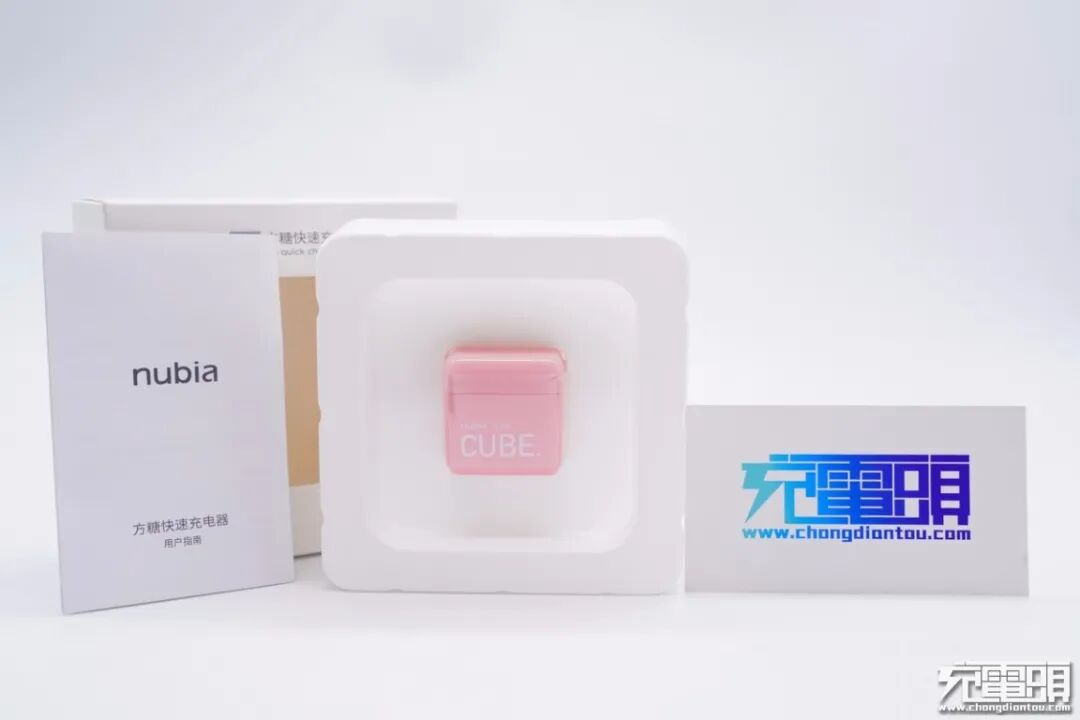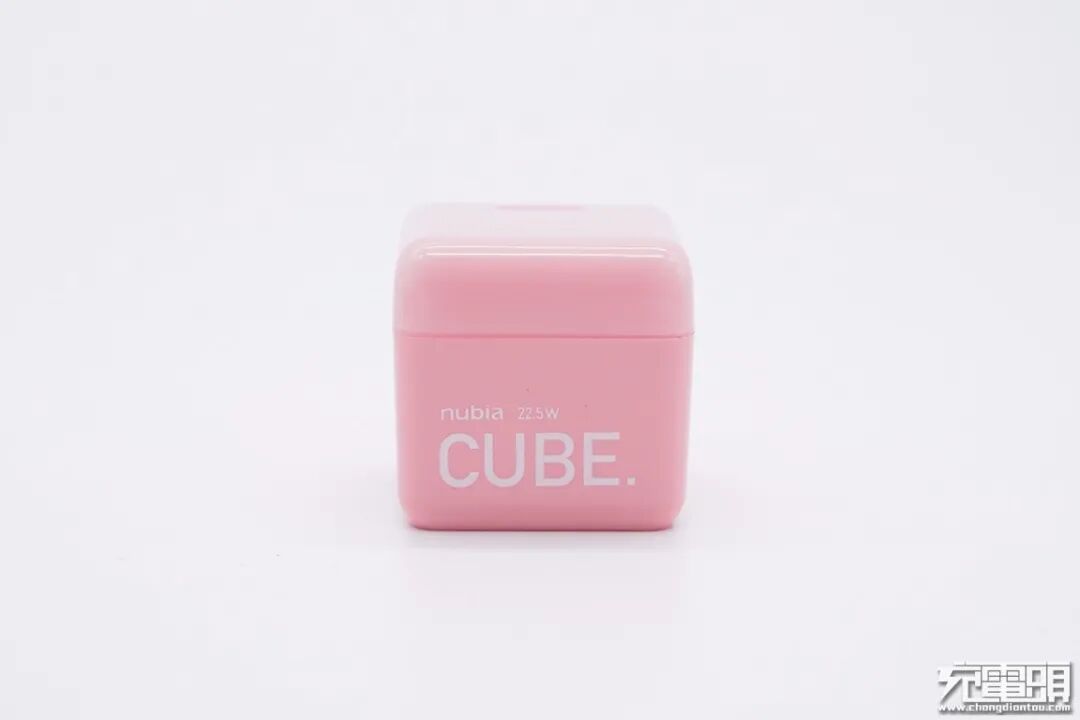 这款充电器采用标准的立方体造型设计,同时外壳为粉色,看上去就像一块糖果,小巧可爱,很容易打动女性消费者。机身正面印有nubia 22.5W CUBE字样。