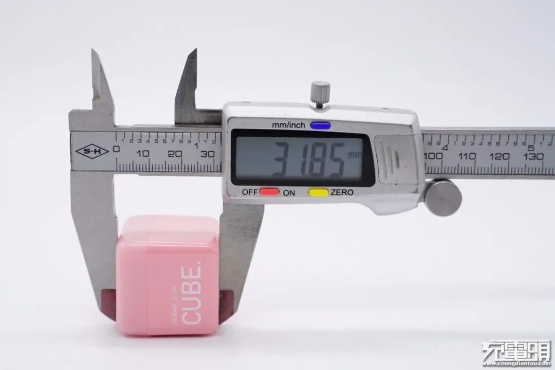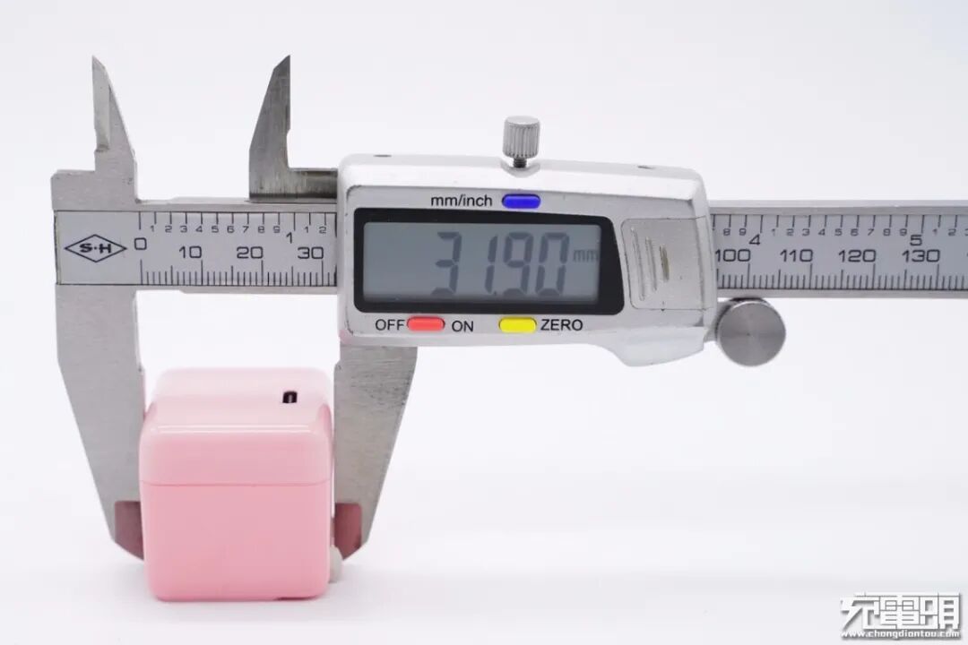 使用游标卡尺实测充电器机身宽度为32mm。