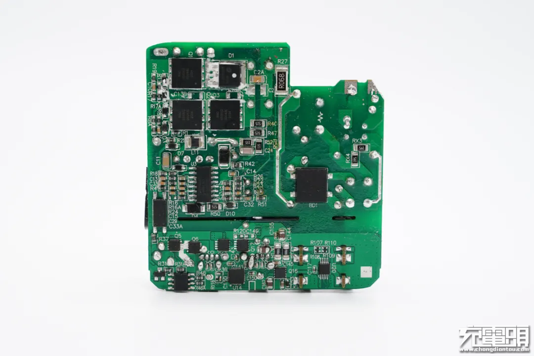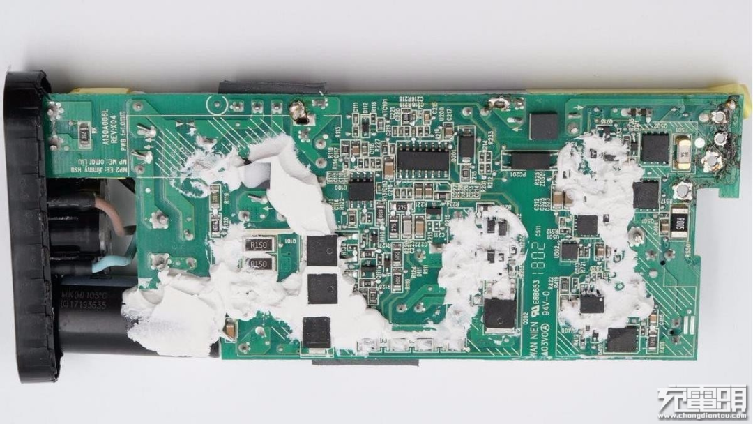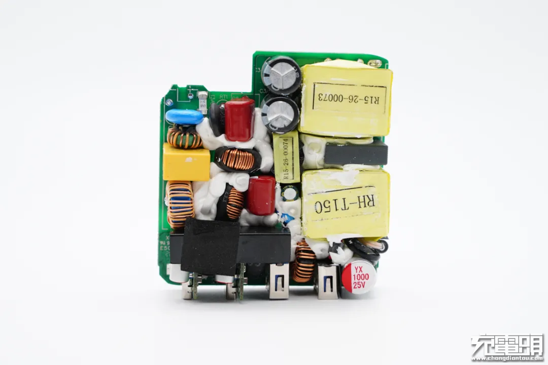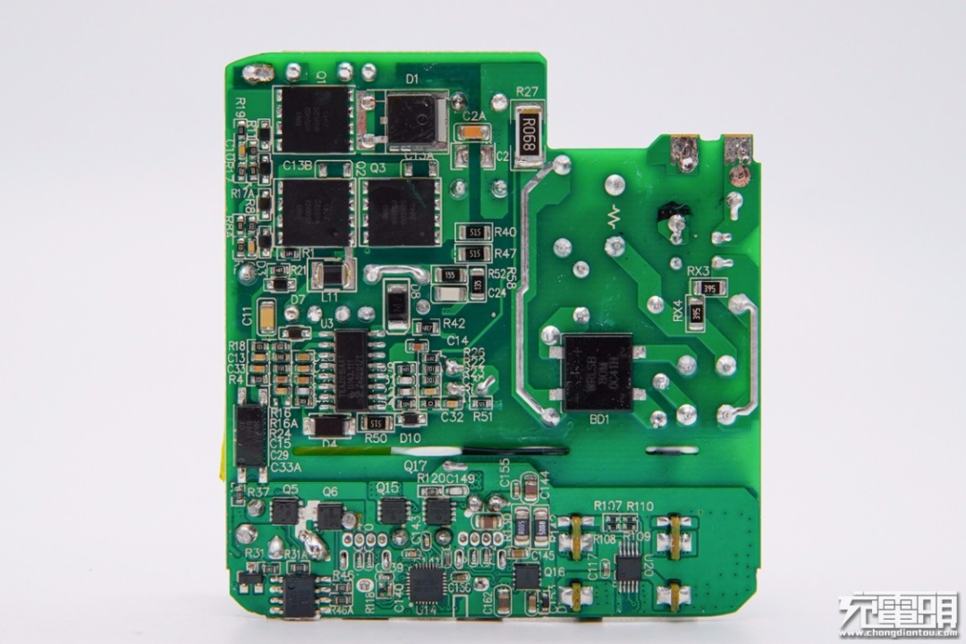 这款100W充电器PCB板上元器件布局紧凑有序,初次级之间设有塑料隔离板,正背面设有大面积黄铜散热片,保证高功率充电状态下的散热性能。此外输入端采用昱光电解电容进行滤波,输出端设有二次滤波固态电容进行滤波,输出纯净。
