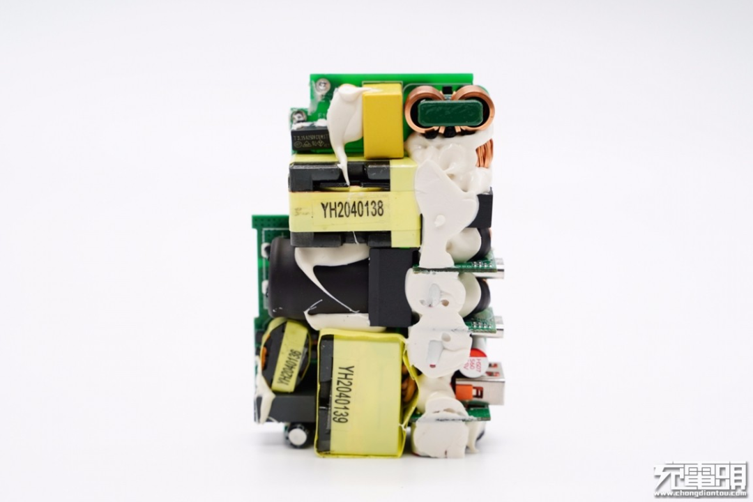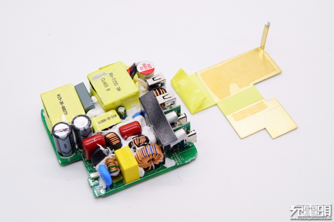 充电器内部使用上下两块大型纯铜散热片覆盖帮助散热,板子正反面大量打胶进行固定和导热,增强充电器散热性能,使其在130W大功率充电时也能有很好的散热效果。此外电感电容等元器件以及隔离板包裹绝缘胶带,保护措施到位。