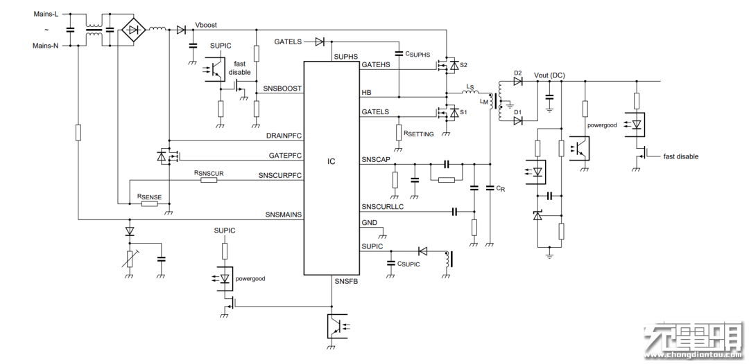 LLC架构属于双管半桥谐振,采用谐振电感、励磁电感和谐振电容串联,故名LLC。采用零电压开关(ZVS)软开关技术,具有工作频率高、损耗小、效率高、体积小的优点,可提高充电器功率密度。