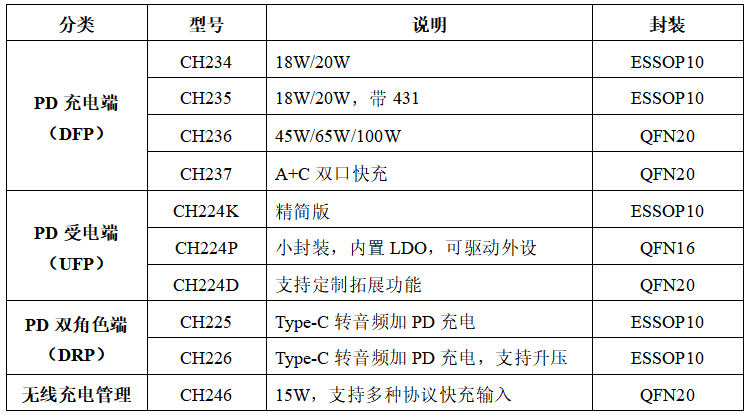 南京沁恒微电子股份有限公司是一家数模混合集成电路设计公司,成立于2004年。主要产品包括:有线网络、无线网络、USB和PCI类接口芯片及集成上述接口的单片机。基于多年USB接口协议及集成电路设计经验,沁恒微电子推出了一系列的协议快充类产品,包括PD充电端(DFP)、PD受电端(UFP)、PD双角色端(DRP)、无线充电管理芯片等,可广泛应用于快充电源适配器、Type-C拓展坞、无线充电、电动工具等领域。