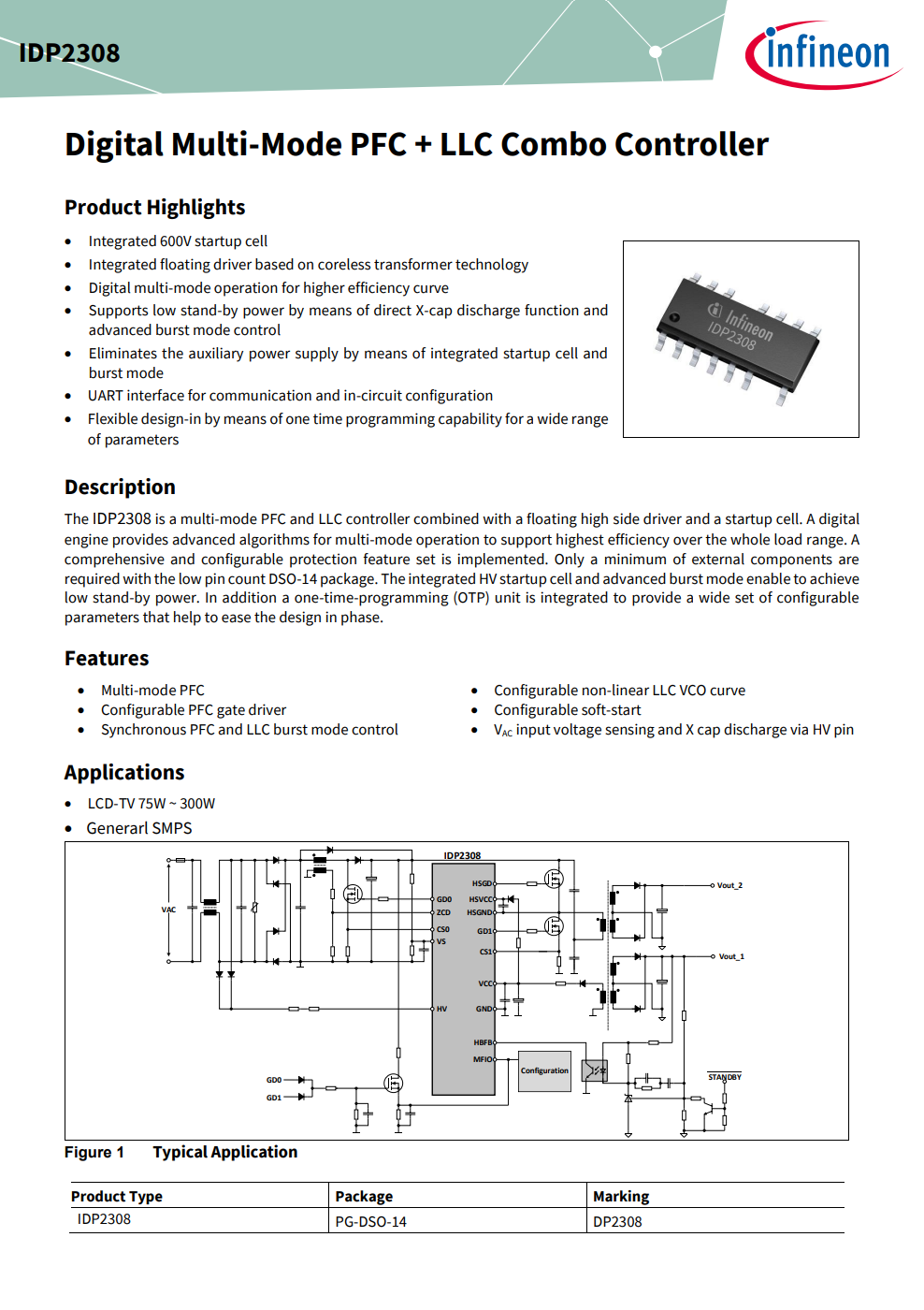 英飞凌IDP2308是一个数字多模式PFC和LLC控制器,集成了浮动高侧驱动器和启动单元。数字引擎为多模式操作提供高级算法,以支持整个负载范围内的最高效率,实现了全面且可配置的保护功能。DSO-14 封装仅需要最少的外部组件。集成的高压启动单元和先进的突发模式可实现低待机功率。此外,集成了一个一次编程 (OTP) 单元,以提供一组广泛的可配置参数,有助于简化相位设计。