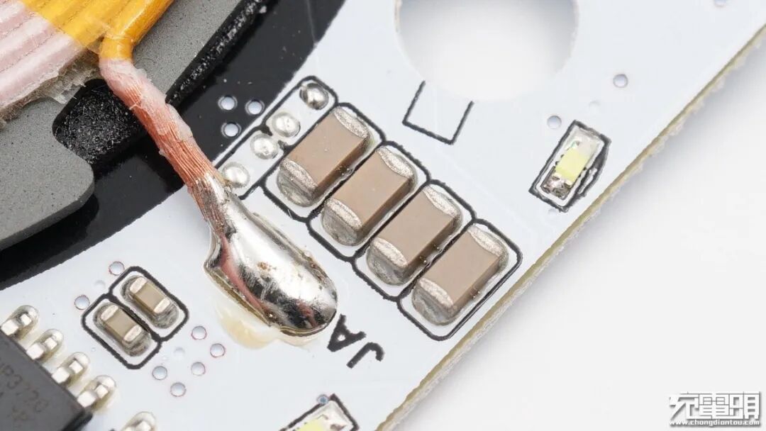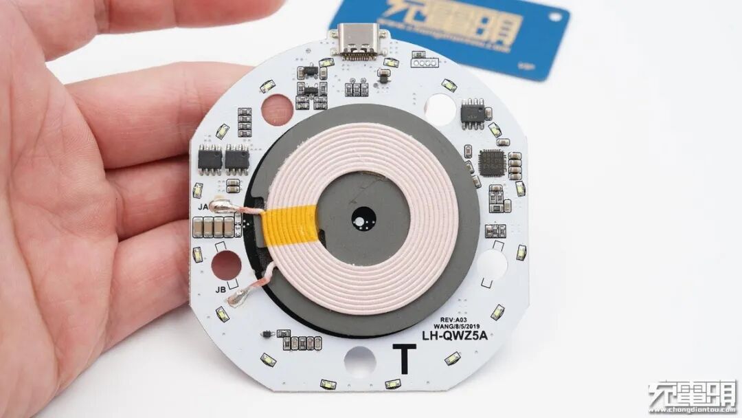 充电头网通过拆解了解到,这款产品内部结构简单,PCB板使用固定柱固定,和无线充电线圈以及锌合金金属壳之间均做了隔离处理。电路板采用单面放置元件,无线充主控芯片采用联智CWQ1000,该芯片的最大功率可达15W。
