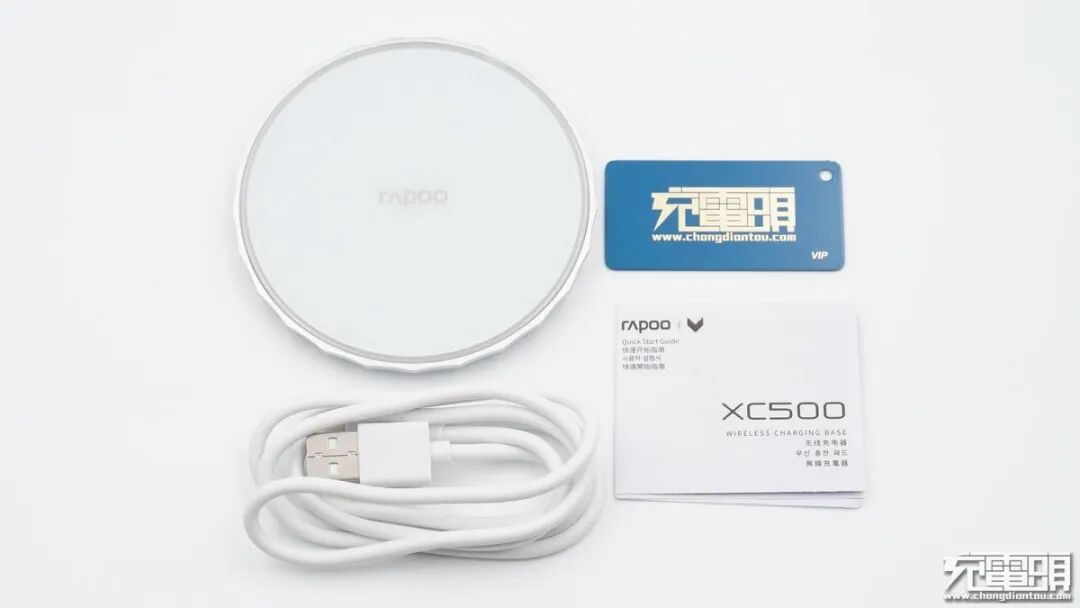 包装盒采用蓝色配色,正面印有Rapoo品牌、无线充外观图(黑白款)、XC500型号、10W功率以及防伪标签等。