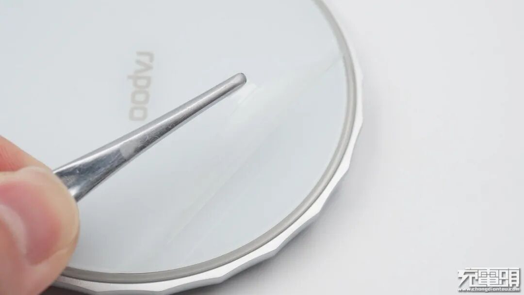 雷柏Ralemo Air1无线充电器底部采用锌合金机身壳,顶面贴合玻璃,十分光滑,增加产品的手感和美感。此外机身顶面中心印有Rapoo品牌。