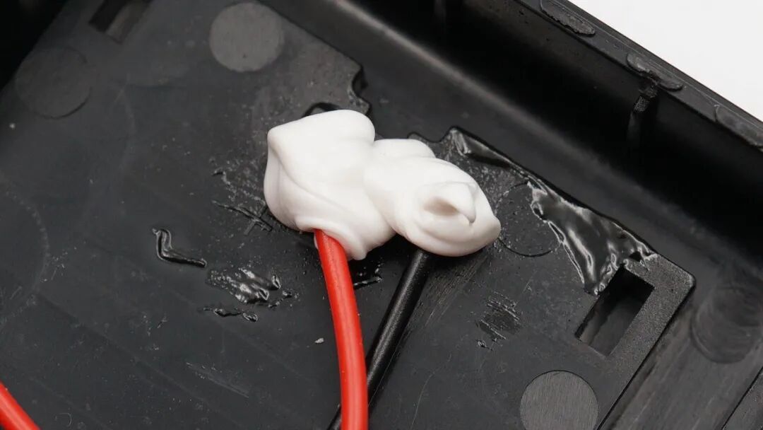 将电池盒拆开,内部一共设有两颗锂电池,电池一端贴有双面胶帮助固定。