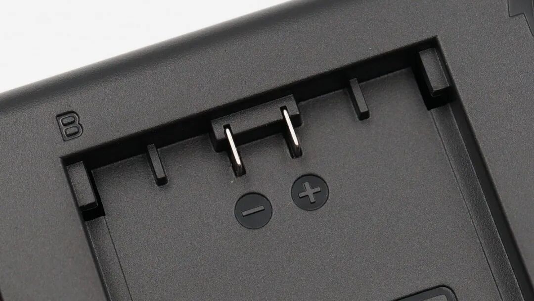 充电槽特写,插槽边设有A和B字样加以区别,用于对应LED指示灯。槽内设有定位板和正负极触点,旁边是正负极标识。